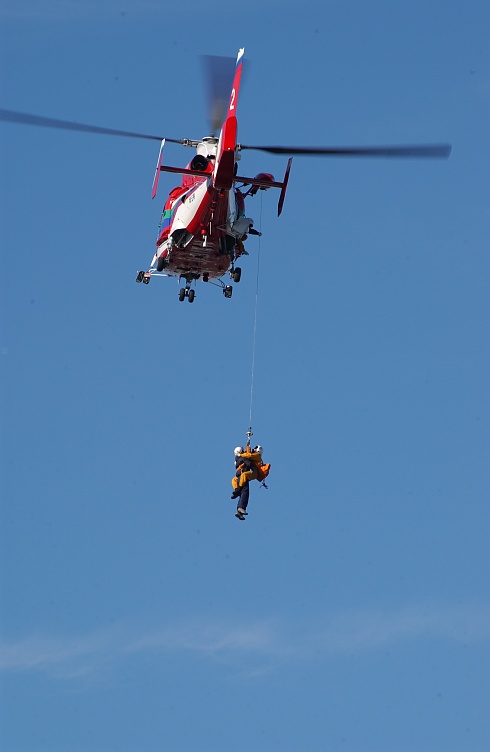 担架に乗せた要救助者と隊員をホイストで吊り上げ。 |